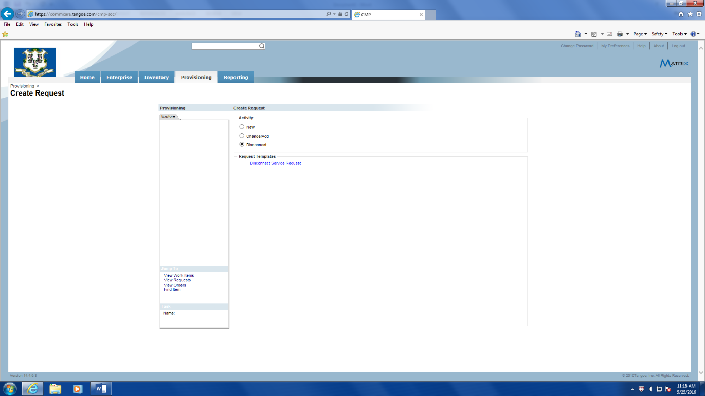 - Select the ‘Disconnect’ radio button and click the ‘Disconnect Service Request’ hyperlink to open the request template.