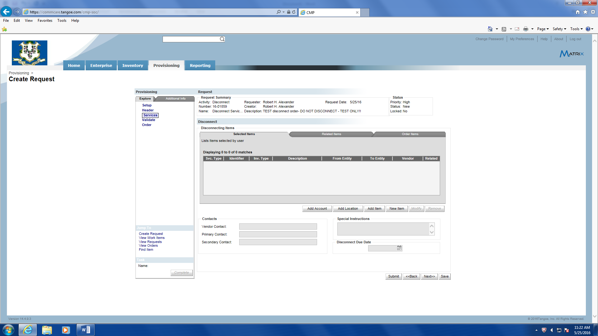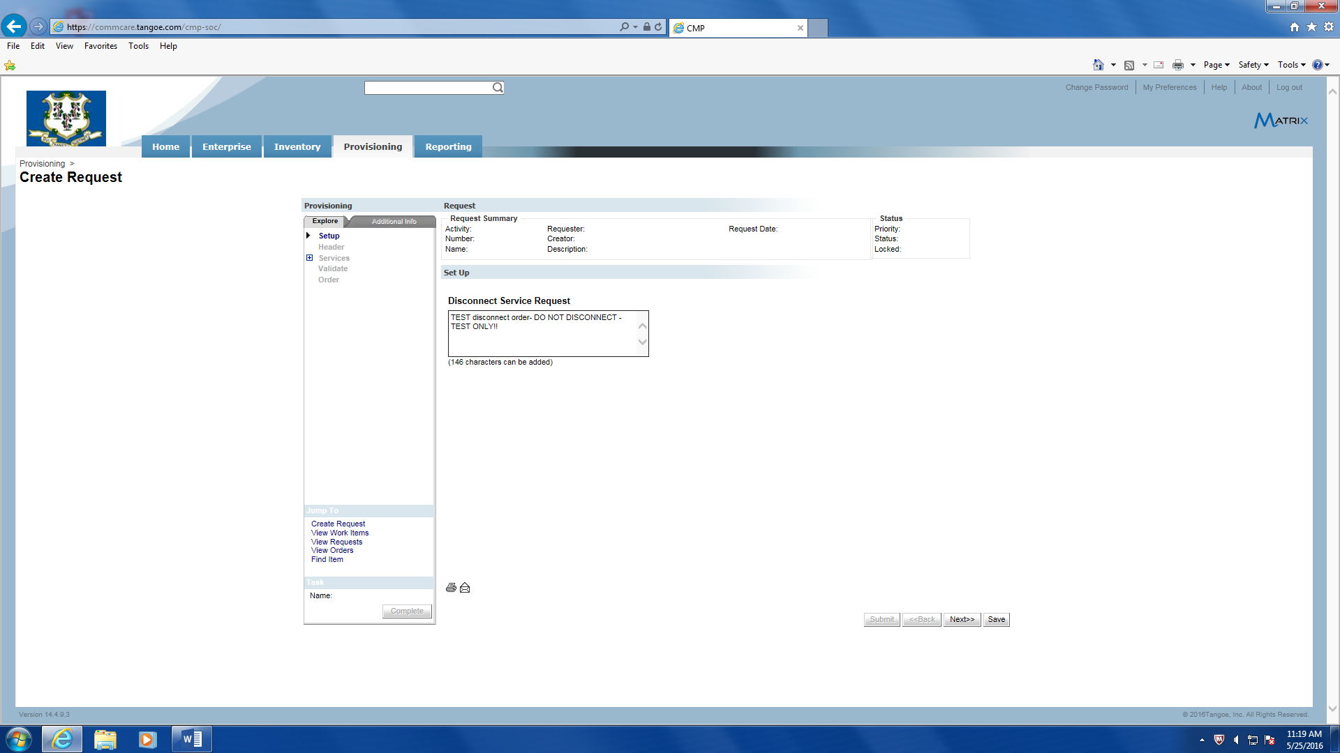 - Enter the date that the requestor would like to have the service disconnected in the ‘Request Date’ field.