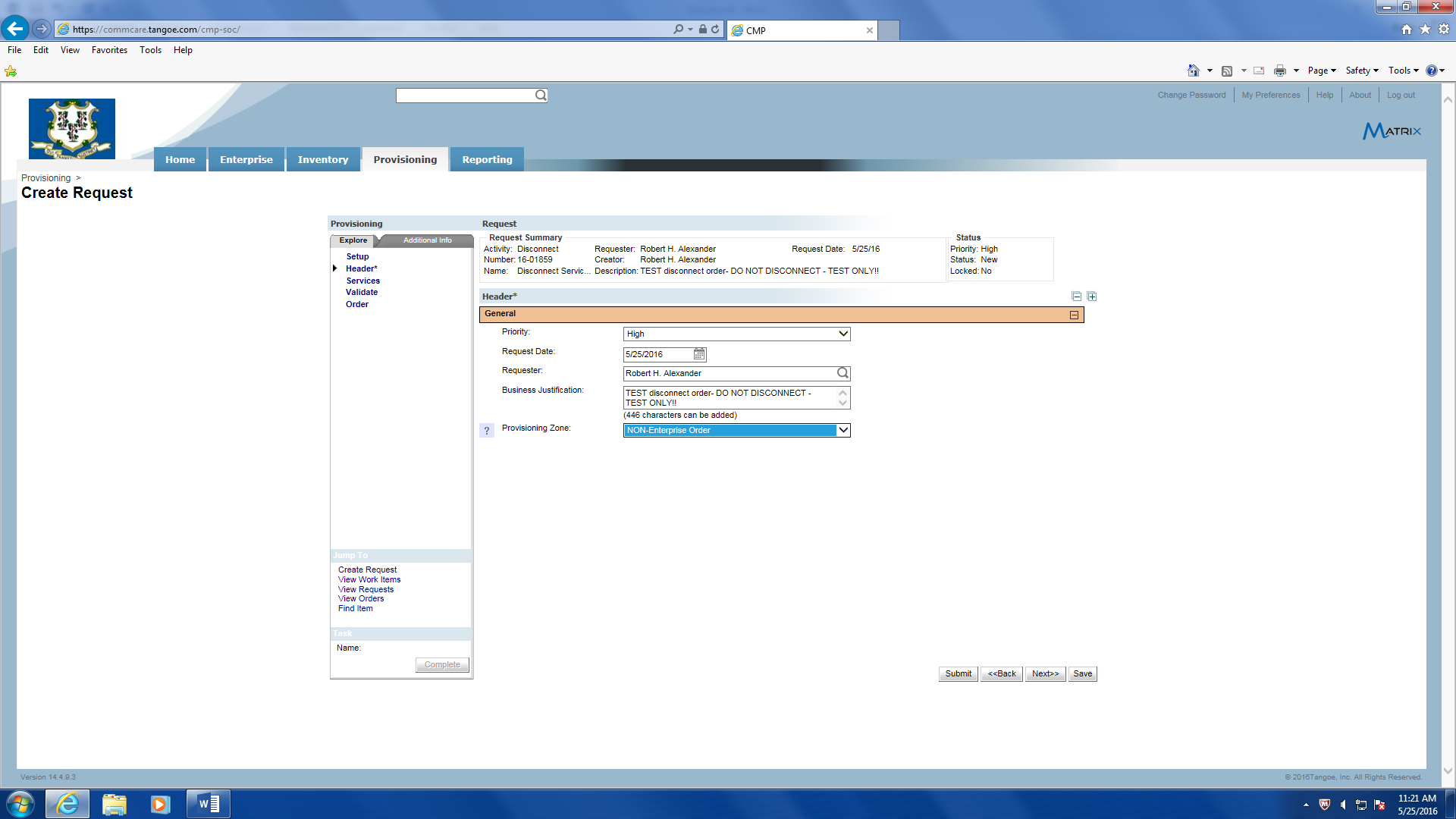 - From the main screen, select the ‘Provisioning’ tab and then the ‘Create Request’ option.