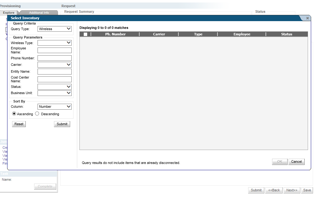 - At the pop-up window, select a ‘Query Type’ from the drop down window that defines the device being disconnected and then the appropriate identifier for the item. The below example is for ‘Wireless’, then enter the wireless ‘phone number’ and click submit. Click on the line item result and then click ‘OK’. Repeat this step for multiple disconnect items from the same vendor.