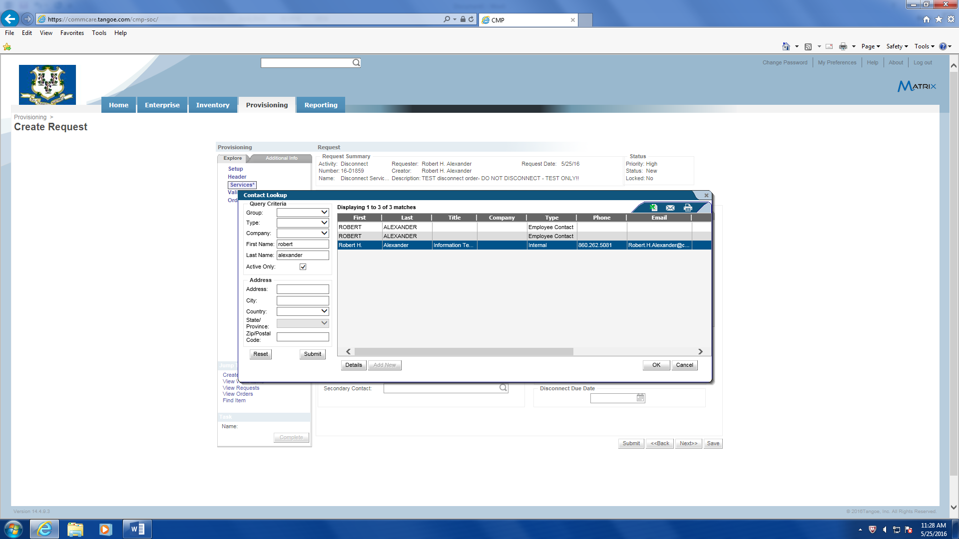 - Click the ‘Primary Contact’ field magnifying glass and enter the employee’s first and last name, and click the ‘Submit’ button. Add a ‘Secondary Contact’ if needed following the same process.