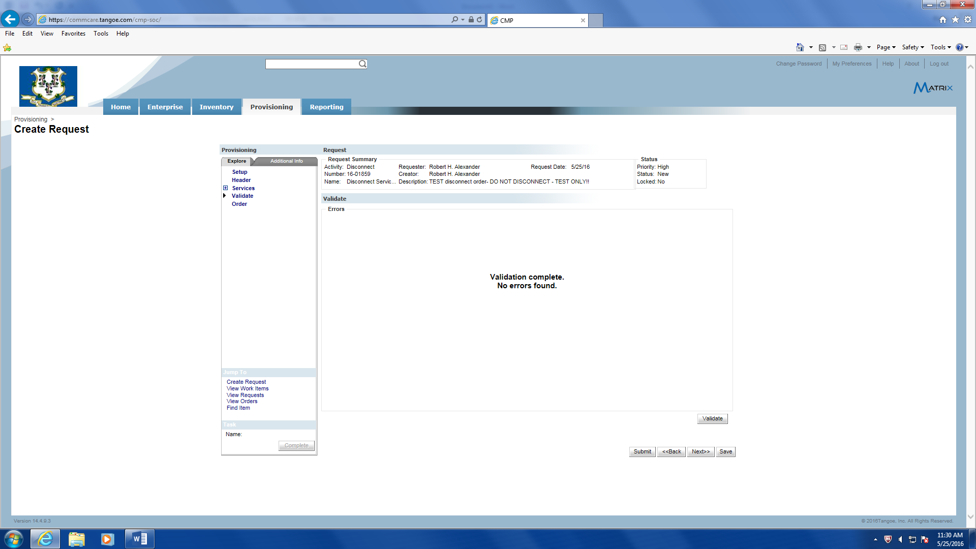 - On the ‘Validate’ screen click the ‘Validate’ button and if a failure occurs there will be a ‘Fix’ hyperlink next to the error message to link to the page where the error occurred. Click on the ‘Fix’ hyperlink, correct the error, and proceed to validate again. Once all errors are fixed click the ‘Submit’ button to process the disconnect order.