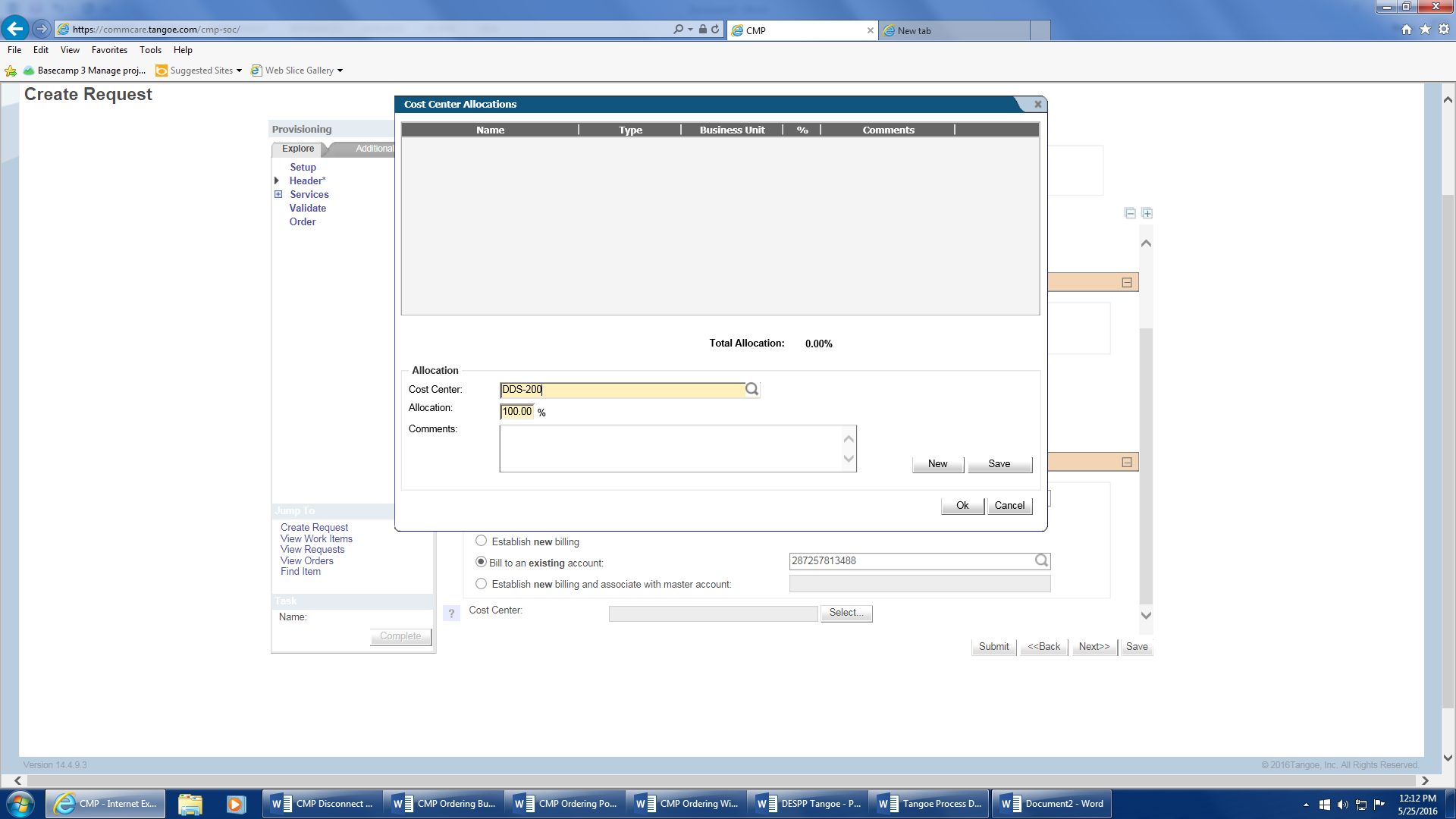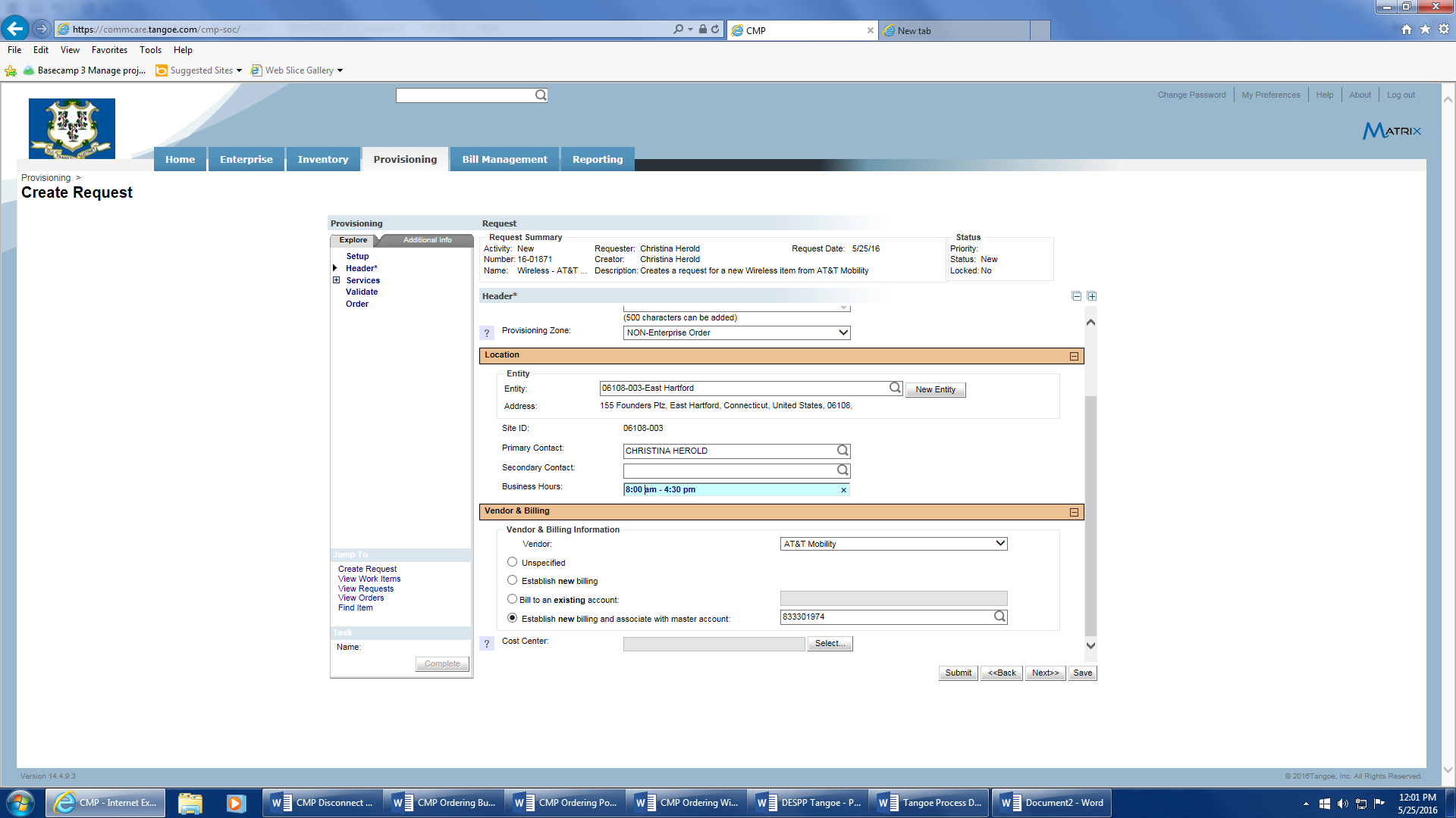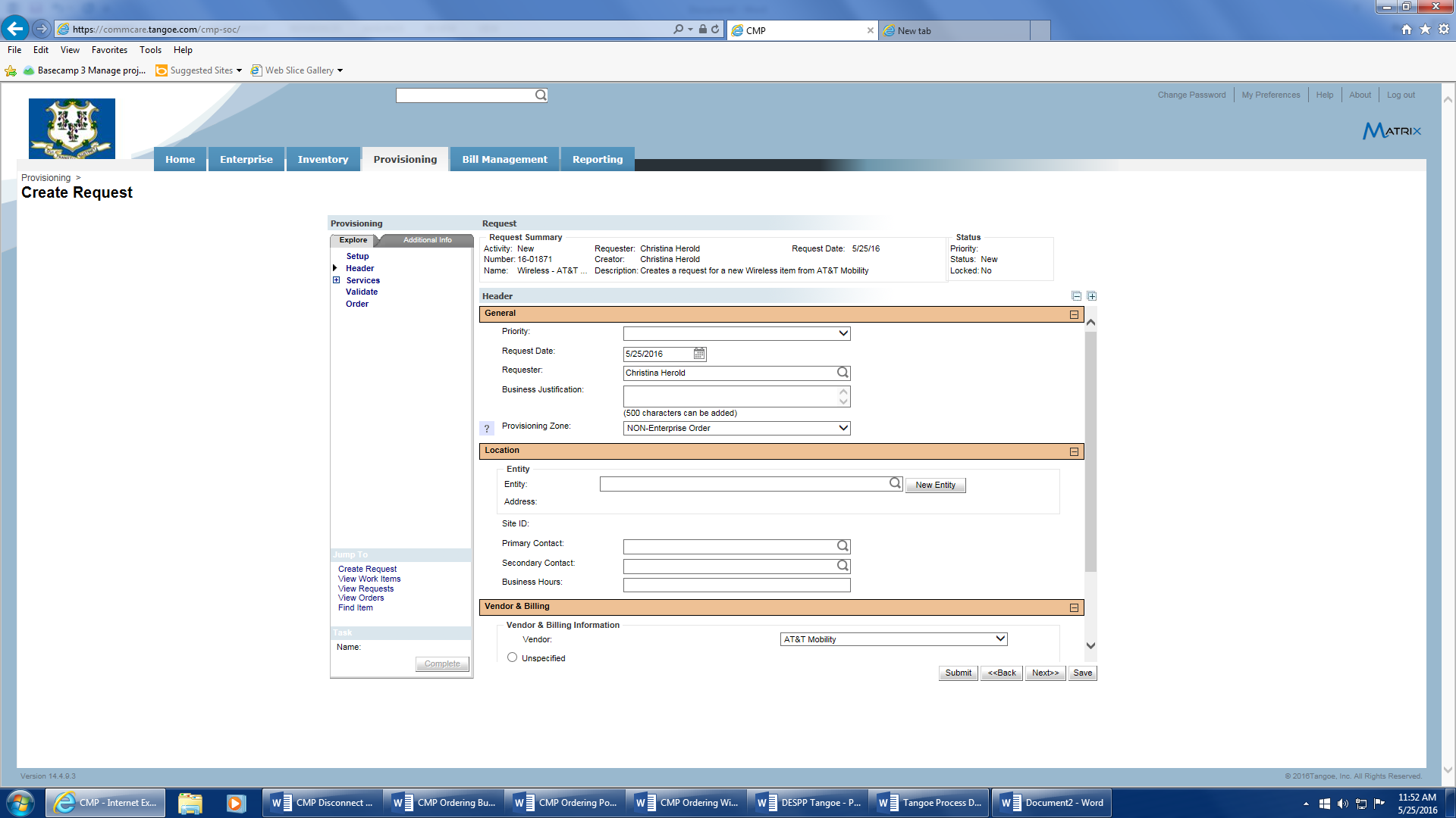 - Request Date – will auto populate with the date the request is generated in Tangoe.