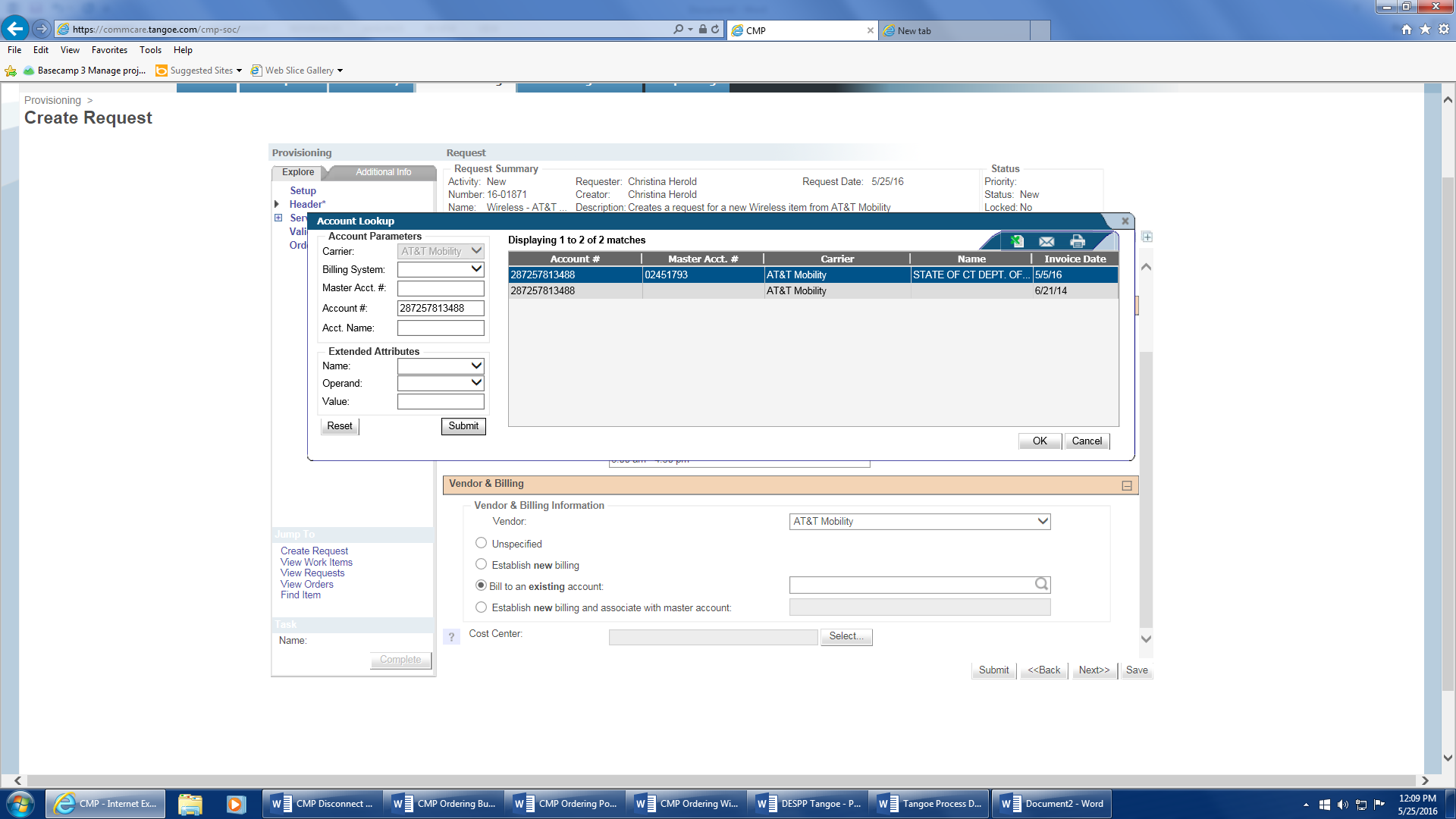 - Click on the magnifying glass to the right and a pop-up window will appear. Enter your agency’s wireless vendor account number in the Account # field, highlight the account, and click ‘Ok’.