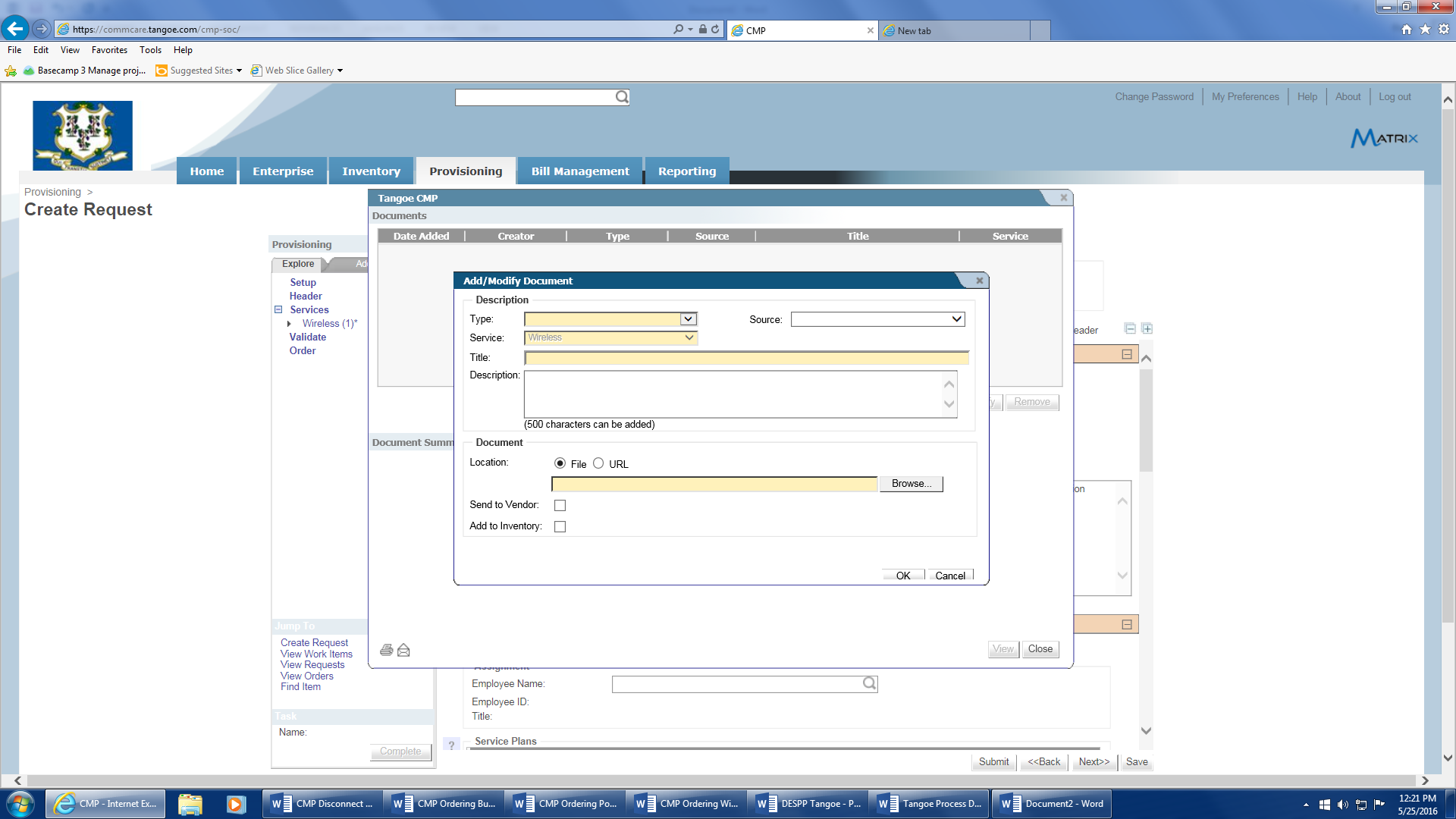 - There is a ‘Documents’ link which allows you to upload and attach applicable supporting documentation if necessary. If not needed proceed to the ‘Service Information Section’.