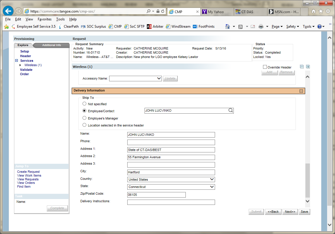- Select the employee and note that the employee’s address appears in the delivery information address fields. If this device is to go to another site/address enter the address information directly into the related fields.