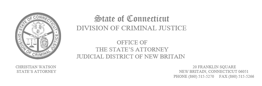 State’s Attorney Watson wishes to extend his gratitude for the extensive investigation efforts of the New Britain Police Department, Massachusetts State Police, New York State Police and the Department of Public Safety Division of Scientific Services who tirelessly pursued this case. This matter was also prosecuted by former Deputy Assistant State’s Attorney Christopher A. Griffin who is now a Superior Court Judge.