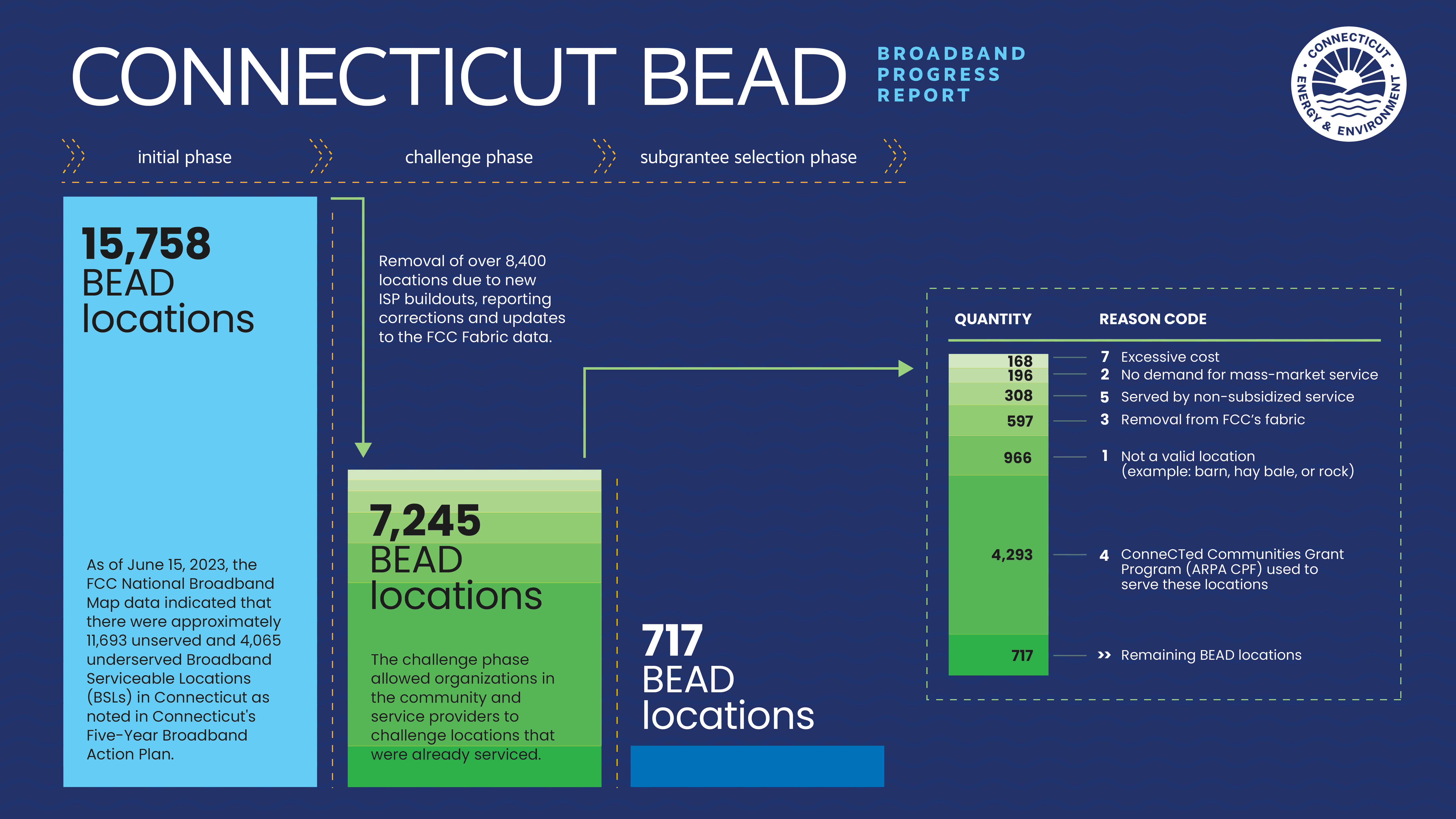 The goal of the BEAD challenge process was to improve the Connecticut BEAD Program Broadband Map so DEEP has an accurate map to make funding decisions. Through the Challenge Process, eligible challengers were able to provide information indicating whether certain locations should or should not be eligible for funding. The Challenge Process opened April 1, 2024, and closed on July 22, 2024. BEAD Challenge Process results received NTIA approval on December 12, 2024. The results of the Challenge Process are as follows: