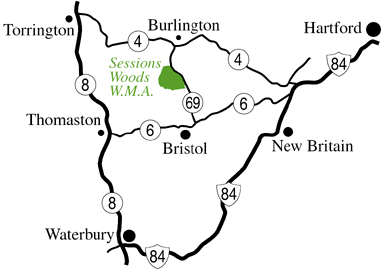 Sessions Woods WMA and Conservation Education Center is located on Route 69, about three miles south of Route 4 in Burlington and three miles north of Route 6 in Bristol. (341 Milford Street, Burlington).