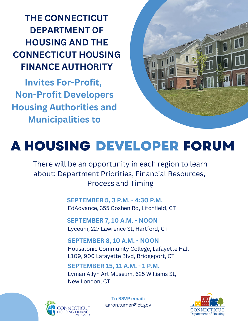 The Connecticut Department of Housing (DOH) Community and Housing Development unit, in conjunction with the Connecticut Housing Finance Authority (CHFA), is hosting four forums across the state for housing developers.