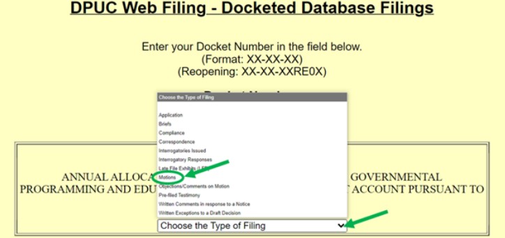 Once you have created an account, your application may be filed as a motion by first selecting “Add to a Current Docket Filing” on the Web Filing Start Page. Please do NOT select “File a New Docket Application.”