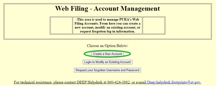 A. You must first register here to access the web-filing account management system and submit an electronic filing to PURA. If you have not yet created an account, please select “Create a New Account” and follow the instructions. Please note that it may take an hour before your account is activated.