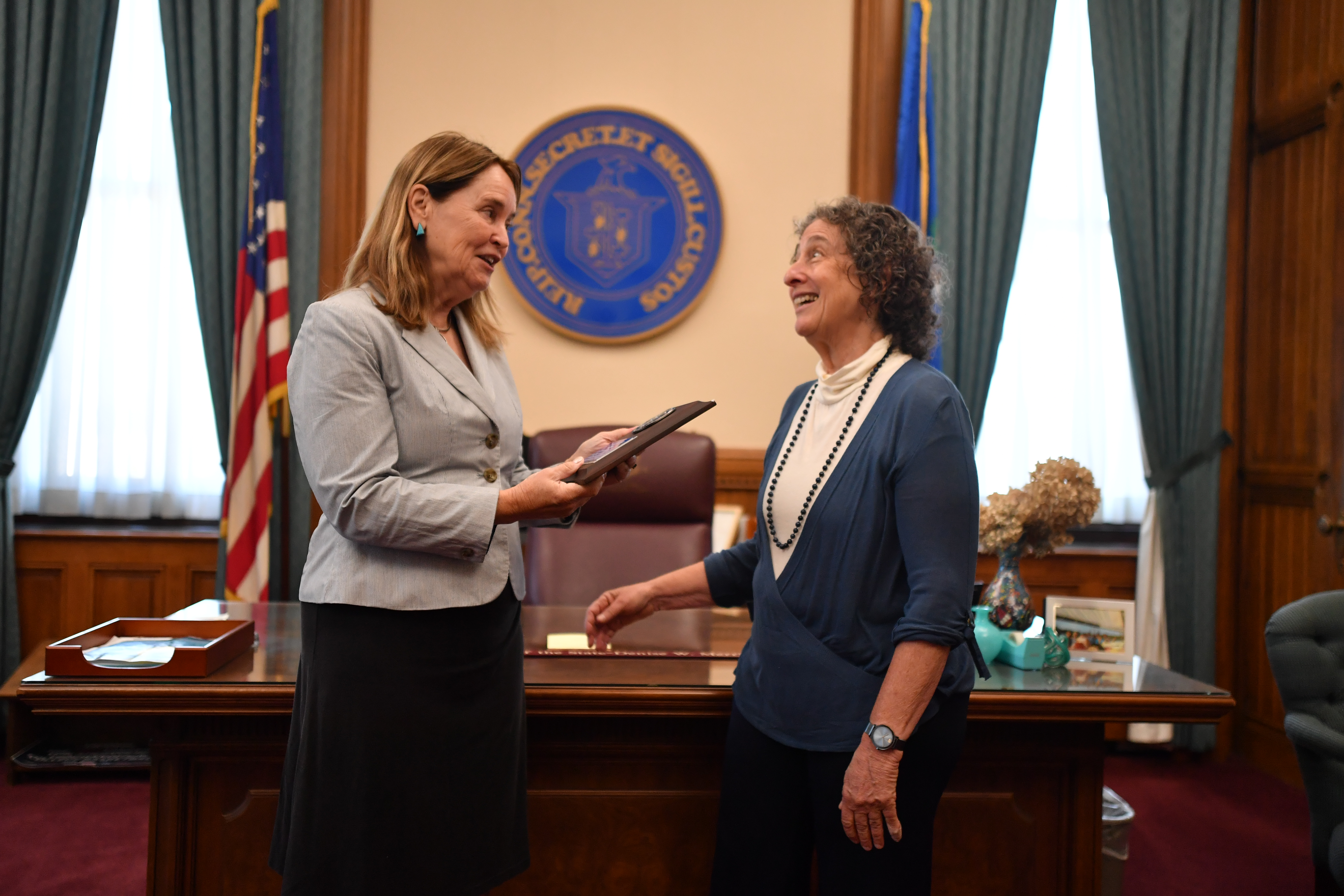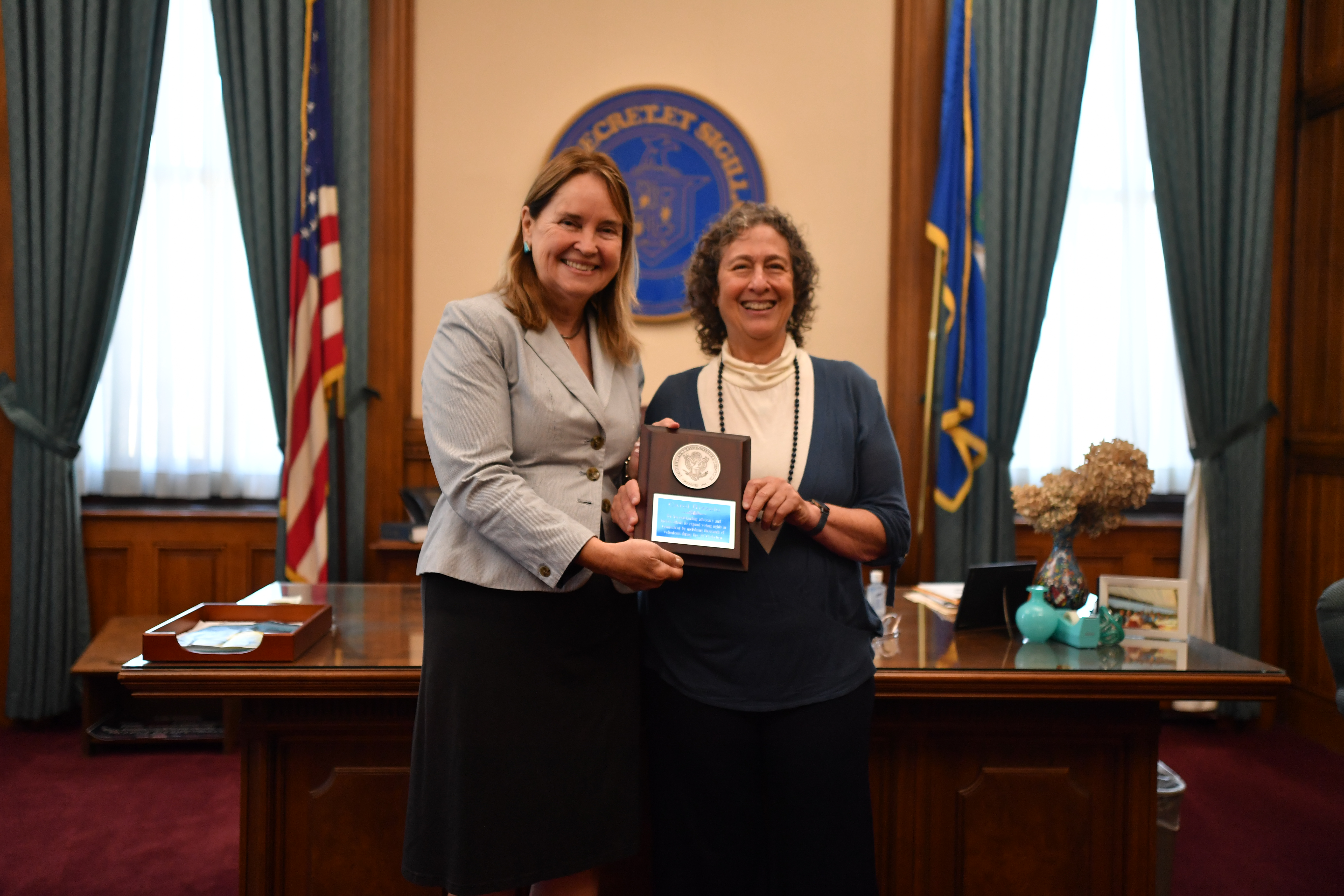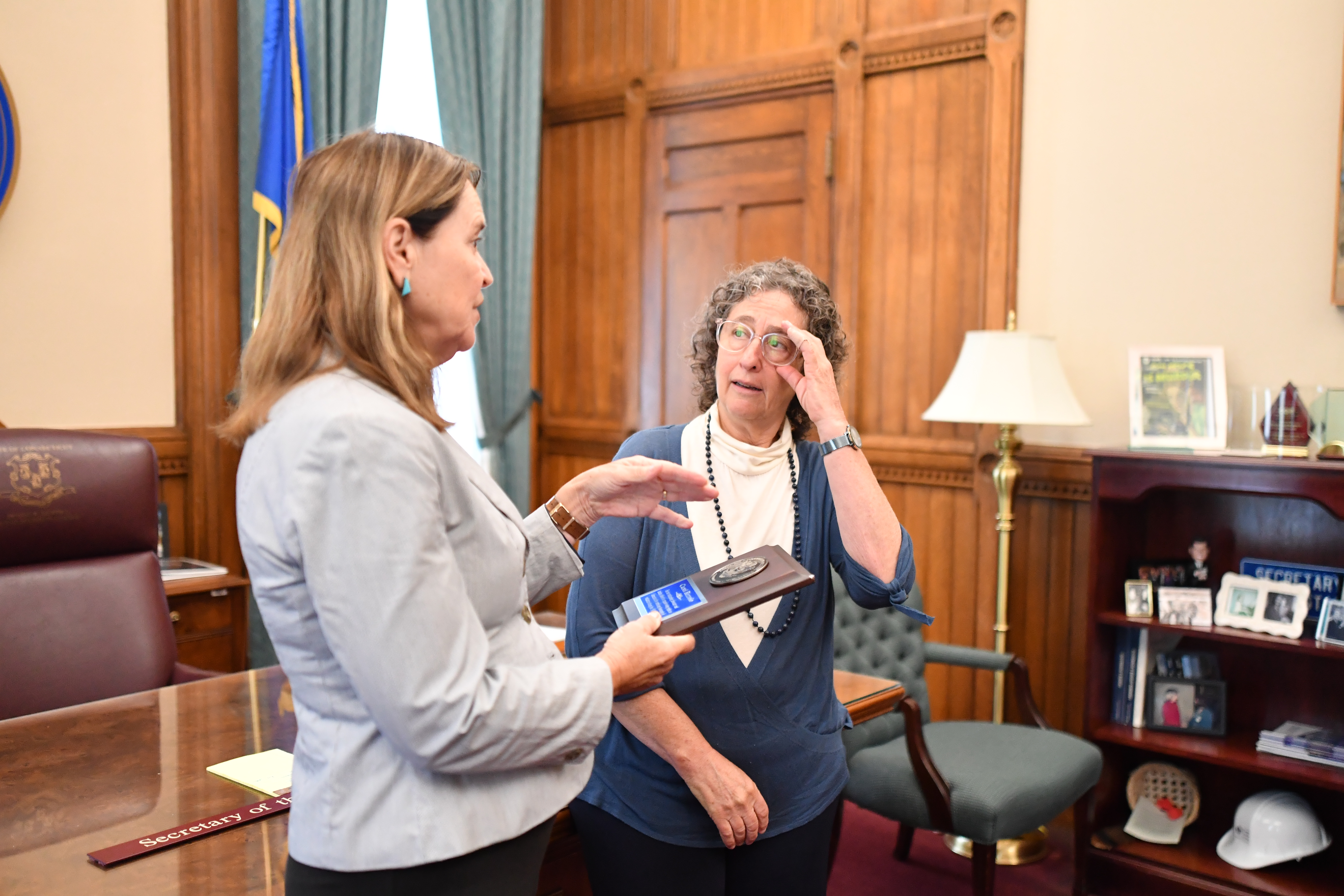 HARTFORD – Connecticut Secretary of the State Denise Merrill yesterday awarded Guilford’s Carol Rizzolo with a NASS Medallion Award for her advocacy and leadership on behalf of critical election reforms over the past two years. The Medallion Awards were created to recognize those who have demonstrated outstanding service and dedication to furthering the mission of the National Association of Secretaries of State (NASS) with respect to elections, voter and civic education, service to state government, or commitment to giving. Rizzolo was instrumental in the successful effort to pass the resolutions to amend the Connecticut Constitution to allow for early voting and universal access to absentee ballots, as well as the expansion of Automatic Voter Registration, the restoration of voting rights to people on parole, and making the popular secure absentee ballot drop boxes a permanent feature of Connecticut elections.