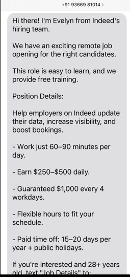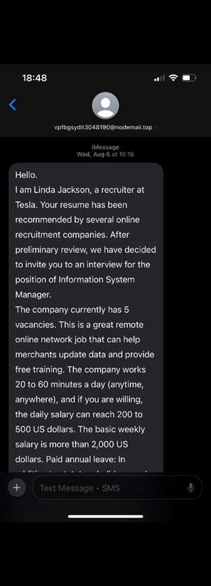 4. If you “get” a job after responding to an unsolicited text, you should receive an offer letter on company letterhead setting forth the terms and conditions of employment. If you do not receive one, the job offer was a scam.