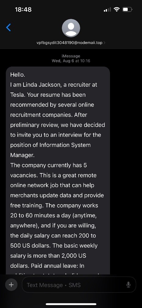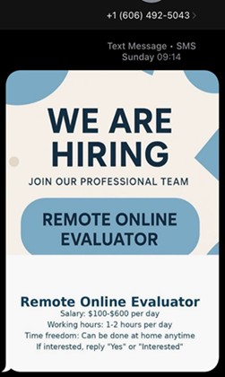 • Text messages that come from foreign country codes even though they advertise U.S.-based jobs and texts that arrive outside normal U.S. business hours.