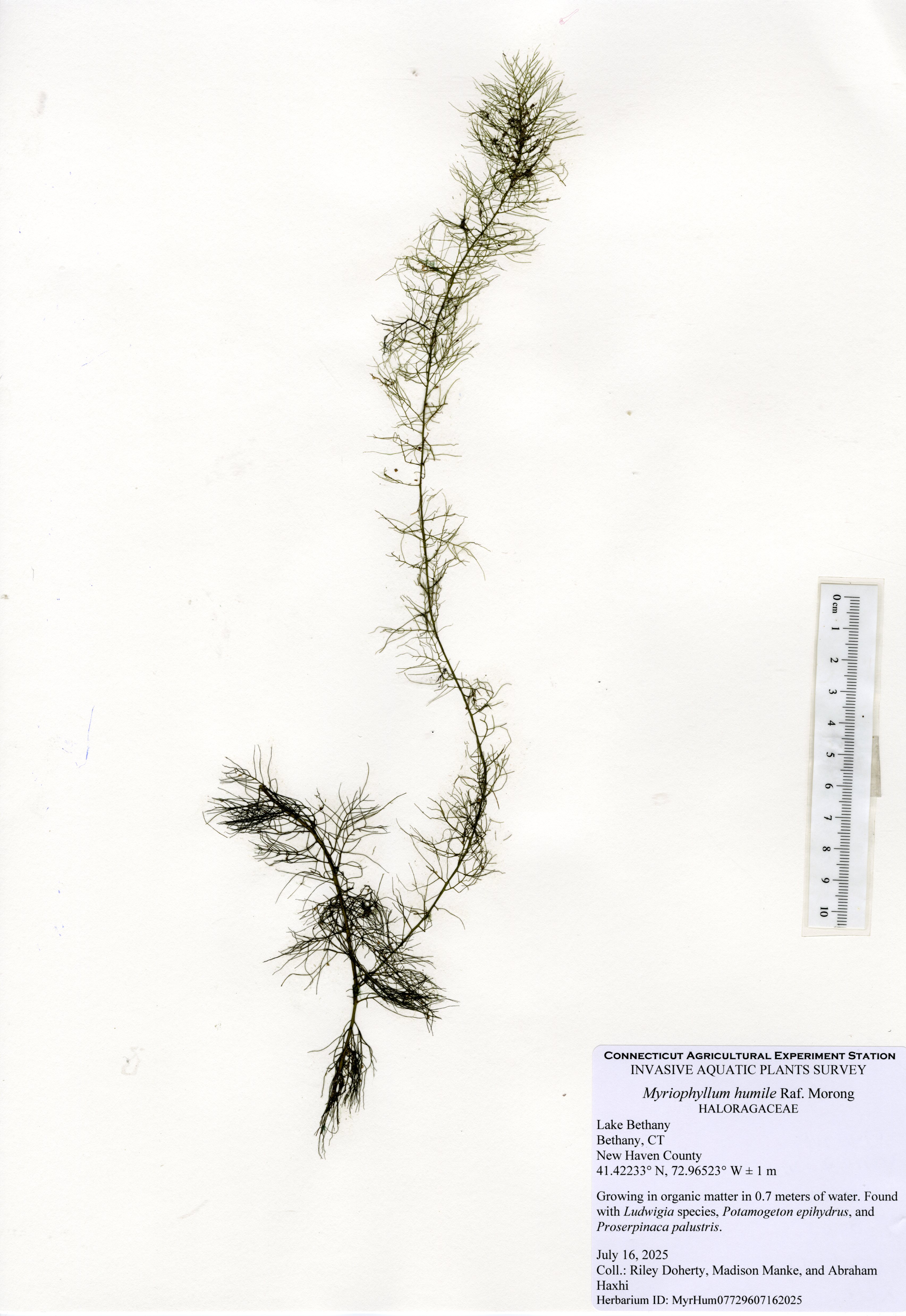 CAES OAIS surveyed Lake Bethany for the first time on July 15–16, 2025. A total of 17 native species were documented. The only invasive species was phragmites (Phragmites australis), which occurred in small patches along the northern and southern shores. The three most abundant species were spikerush (Eleocharis species), waterwort (Elatine species), and primrose-willow (Ludwigia species), which were predominant on the eastern side of the lake and in the northern coves. Swamp loosestrife (Decodon verticillatus) and cattail (Typha species) were found sparsely along the shoreline. Ribbon-leaf pondweed (Potamogeton epihydrus) and Berchtold’s pondweed (Potamogeton berchtoldii) were found in dense patches at the northern end of the reservoir, growing in relatively shallow water. Common bladderwort (Utricularia vulgaris) often co-occurs with phragmites.
