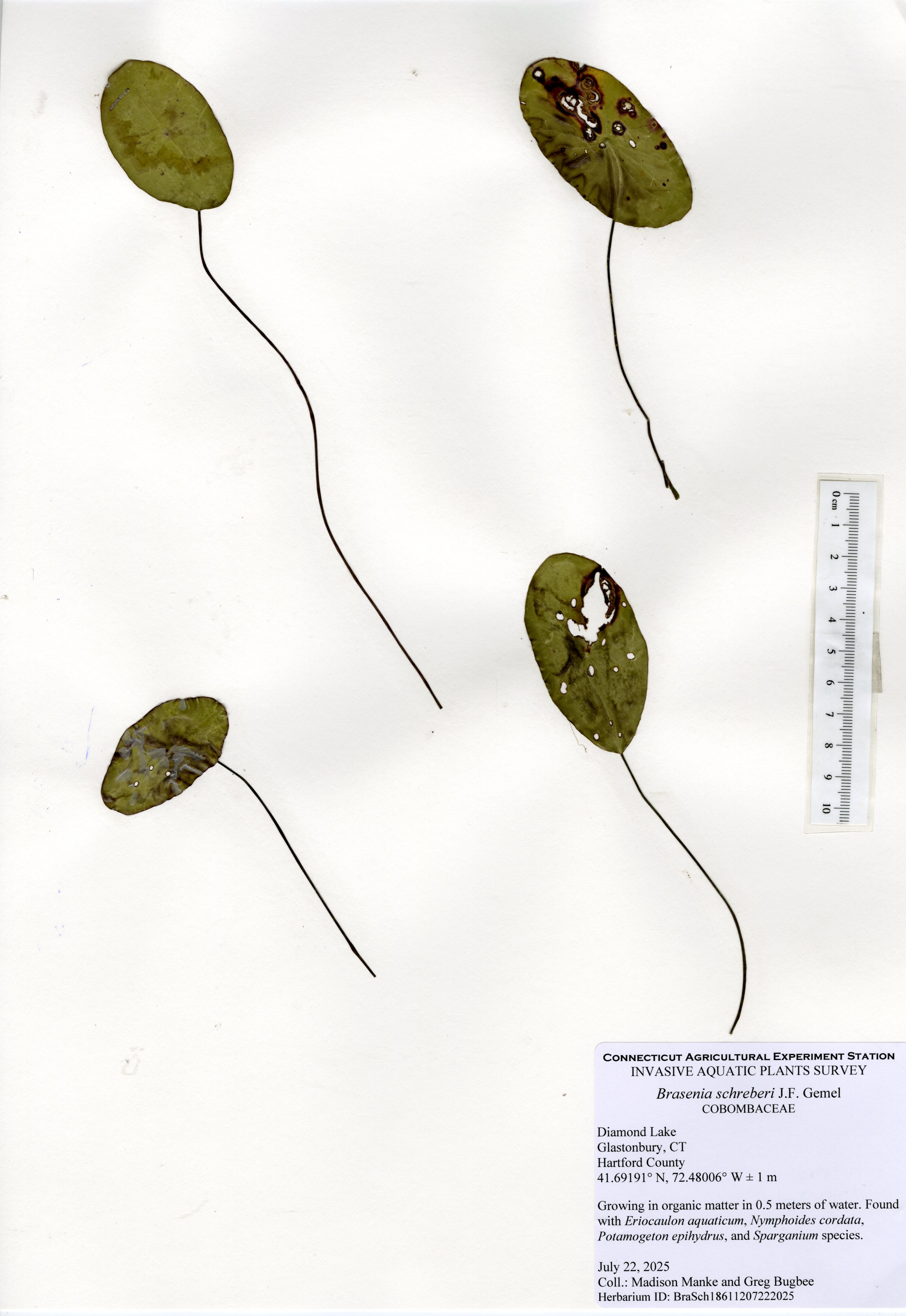 The dominant species in 2025 were white water lily (Nymphaea odorata), watershield (Brasenia schreberi), ribbon-leaf pondweed (Potamogeton epihydrus), and little floating heart (Nymphoides cordata). Western waterweed (Elodea nuttallii), slender naiad (Najas flexilis), and humped bladderwort (Utricularia gibba) were commonly found growing together around the lake perimeter, often in association with seven-angle pipewort (Eriocaulon aquaticum), which was particularly abundant along the southern shoreline. Emergent, wetland species, including bur-reed (Sparganium spp.), cattail (Typha spp.), and swamp loosestrife (Decadon verticillatus), were consistently present along the shoreline in small patches. Additional species observed in one or two localized areas included snailseed pondweed (Potamogeton bicupulatus), primrose-willow (Ludwigia spp.), Berchtold’s pondweed (Potamogeton berchtoldii), waterwort (Elatine spp.), spikerush (Eleocharis spp.), coontail (Ceratophyllum demersum), low watermilfoil (Myriophyllum humile), and quillwort (Isoetes spp.). Because low watermilfoil can be easily confused with invasive variable watermilfoil, specimens collected from Diamond Lake were examined in the laboratory to confirm species identification.