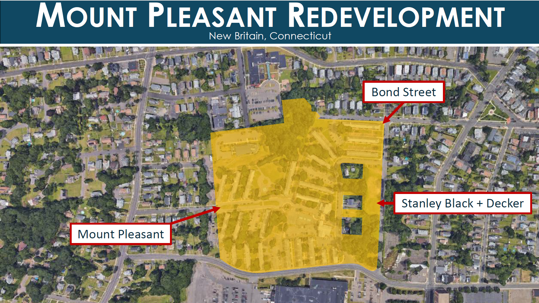 Description: The site is a 22.7-acre property split between the existing Mount Pleasant and Bond Street Public Housing complex and the former Stanley Black plus Decker block nestled between Bond and Armistice Streets in central New Britain. The portion of the project site run by the New Britain Housing Authority (NBHA) currently holds twenty-two (22) barrack-style residential buildings housing 251 dwelling units and two (2) additional free-standing buildings that accommodate NBHA administrative and maintenance offices. Originally constructed circa 1941, the Mount Pleasant Redevelopment intends to demolish the entire site in five separate phases, thus paving the way for new construction that is state-of-the-art, energy-efficient, aesthetically engaging, and safe. Approximately 350 residential units are planned, occupying a range of affordability and size. Consisting of 79 units, the first phase is slated to submit a funding application in 2025.