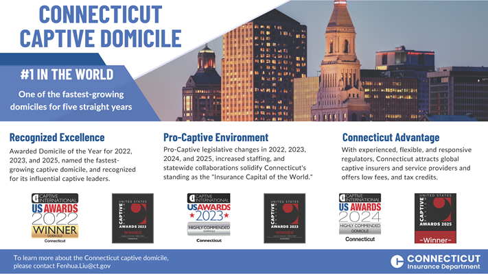 Connecticut has rapidly established itself as a premier, fast-growing U.S. captive domicile, recognized as "Domicile of the Year" for 2022, 2023, and 2025. Leveraging its reputation as the "Insurance Capital of the World," it offers a highly experienced regulatory environment, modern pro-captive legislation, and a robust, accessible network of service providers. The domicile focus is on flexibility, offering tailored risk solutions for both Fortune 500 firms and mid-sized businesses.