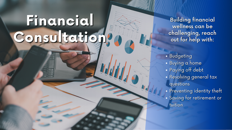 Build financial wellness related to budgeting, buying a home, paying off debt, resolving general tax questions, preventing identity theft, and saving for retirement or tuition.