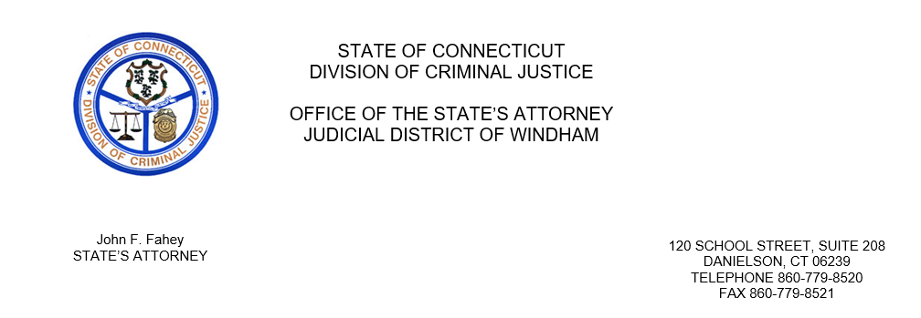 State’s Attorney Fahey praised the diligent work of the Willimantic Police Department as well as the Connecticut State Police Eastern District Major Crime Squad.