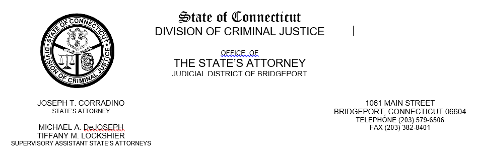 State’s Attorney Corradino praised Inspector Martin Heanue and retired Bridgeport Police Detective Robert Winkler, who led the investigation, for bringing the case to a successful conclusion. Corradino also extended his gratitude to the rest of the Bridgeport Police Department for their efforts, along with the State of Connecticut Division of Scientific Services and the Office of the Chief Medical Examiner for their work. “We are fortunate to have both experienced investigators and talented prosecutors handling these type of cases,” Corradino said.