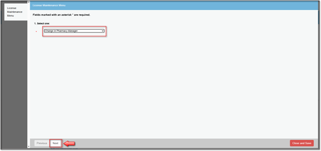 - From the dropdown menu choose "Change in Pharmacy Manager", then click "Next".