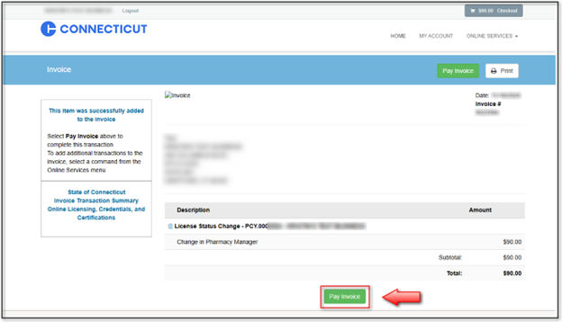 - Click "Pay Invoice". IMPORTANT: Clicking "Close and Save" will only save your progress. It does not submit your request. You must click "Pay Invoice" to submit your request.