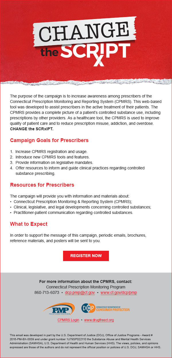 Prescription drug misuse, addiction and overdose are all prevalent problems in Connecticut. People of all ages and ethnic, social, educational, and economic backgrounds are affected. The purpose of the CHANGE the SCRxIPT campaign is to increase awareness among prescribers of the Connecticut Prescription Monitoring and Reporting System (CPMRS).