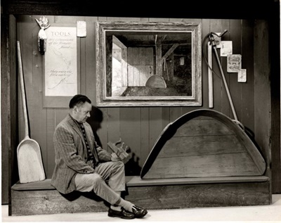 Eric Sloane (1905-1985) is best known for his idyllic landscapes, which often feature New England architecture and expansive skies. Sloane wrote and illustrated many books on Colonial tools, architecture, farming techniques, folklore, and rural wisdom. Each book included detailed illustrations, hand-lettering, and his characteristic folksy wit. Sloane’s fascination with weather led to commissions from the U.S. Air Force, as well as illustrated works on meteorology and weather forecasting. Sloane himself arranged and labeled the museum collection, telling a fascinating story about bygone times and the great American heritage of craftsmanship. The building itself was donated to the State of Connecticut in 1969 by Stanley Works, the Connecticut-based tool manufacturing company.