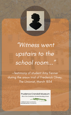 The title is taken from the testimony language of both student Amy Fenner and teacher Mary Burleigh during the arson trial of Frederick Olney in March, 1834.