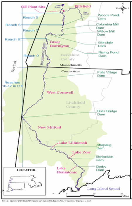 The Housatonic River flows 149 miles downstream from western Massachusetts into western Connecticut until it drains out into the Long Island Sound. The release of PCBs in Pittsfield has contaminated waters in Massachusetts and Connecticut.