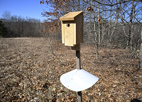 This bluebird nest box is installed on a post with a predator guard in open habitat at a wildlife management area.