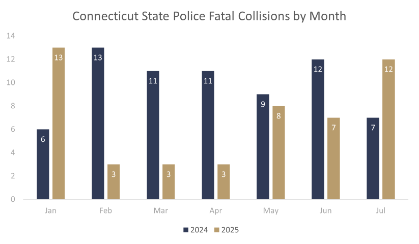 From Jan. 1 through July 31 of this year there were 49 fatal collisions on roads and highways patrolled by the Connecticut State Police, compared to 69 fatal collisions during the same period in 2024.
