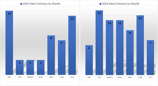"Overall, I am happy to see counts of fatal collisions reducing in 2025 compared to the previous year," said Dr. Michael Mascari, DESPP's Chief Data Officer and Data Scientist. "Particularly in February, March, and April of 2025, we see large declines compared to 2024. It is important to continue monitoring trends regarding fatal collisions and use data to inform our actions."