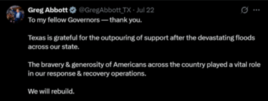 Texas Governor Greg Abbott tweeted his thanks to other states for helping out after the July flooding.