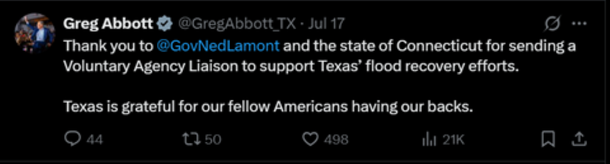 On X, Governor Abbott offered his personal thanks to Gov. Ned Lamont for participating in the EMAC program.