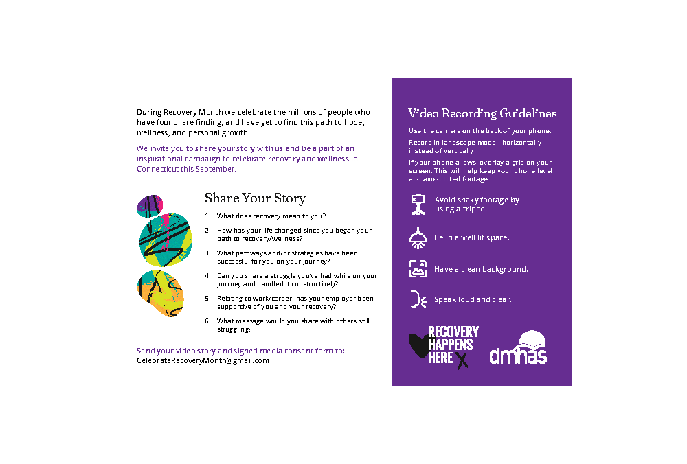 Film a 1-2 minute video describing your journey to recovery and how your life has changed and email it to us at CelebrateRecoveryMonth@gmail.com.