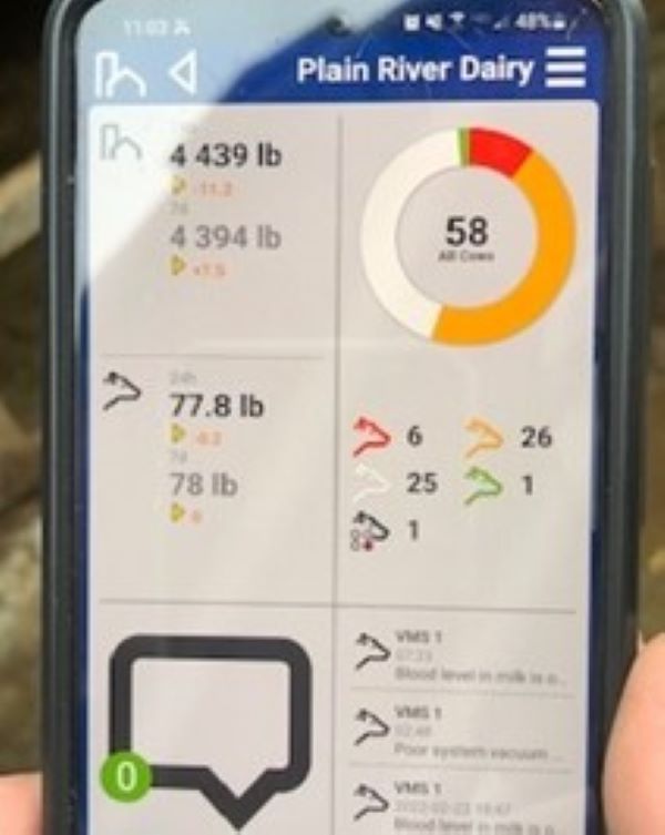 Overall, the installation of the facility has allowed River Plain Dairy to increase herd size by 25%, expanding from 45 to 60 cows. The robot milks one cow at a time and is available to the herd 24 hours per day. An app on his cell phone allows Jeffrey to view all sorts of statistics about the day’s milking, and each animal’s production history is carefully measured and recorded automatically.