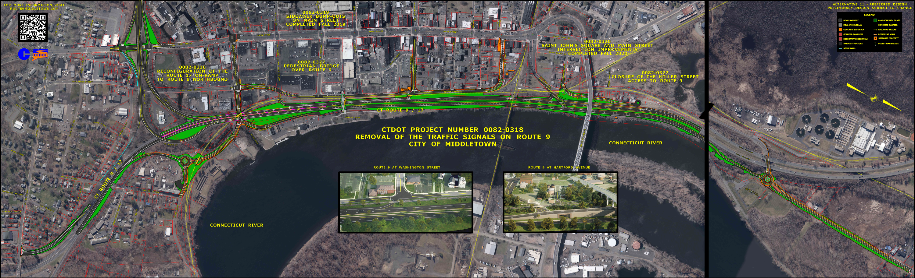 The Connecticut Department of Transportation (CTDOT) is currently developing plans to remove two traffic signals on Route 9 to improve safety and reduce congestion. The project is located on Route 9 from Exit 22 near Silver St. in Middletown to Exit 25 at Route 99 in Cromwell.