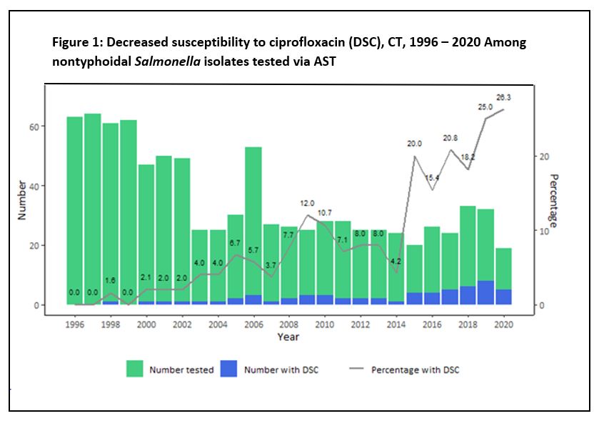 The Centers for Disease Control and Prevention (CDC) has designated drug-resistant nontyphoidal Salmonella as a serious public health threat in their Antibiotic Resistance Threats in the United States, 2019 report (1) based on data from the National Antimicrobial Resistance Monitoring System for Enteric Bacteria (NARMS). NARMS was implemented in 1996 to monitor changes in antimicrobial susceptibility among enteric pathogens, including nontyphoidal Salmonella, by testing isolates from across the country (2). These national data highlighted changes in susceptibility to commonly prescribed antibiotics including ciprofloxacin. Nationally, the proportion of nontyphoidal Salmonella isolates with decreased susceptibility to ciprofloxacin increased from 2% to 8% between 2009-2017(1). Since 1995, Connecticut has participated in the Foodborne Diseases Active Surveillance Network (FoodNet), a collaborative effort between CDC, 10 Emerging Infections Program (EIP) sites, the US Department of Agriculture (USDA), and the Food and Drug Administration (FDA), to monitor the burden of enteric diseases, including salmonellosis (4). This has provided an opportunity to better understand severity of illness, potential exposures before infection, and history of antibiotic use. This is important in the context of antibiotic resistance. Pathogens with decreased susceptibility may lead to more severe disease, including hospitalization; overuse of antibiotic treatment can contribute to antibiotic resistance; and exposures known to be associated with decreased susceptibility or resistance can help narrow down treatment options if antibiotics are recommended (1).Treatment of nontyphoidal Salmonella infection with antibiotics is generally not recommended but may be recommended for case-patients who experience severe illness, are at least 65 years of age, or are immunocompromised (5).
