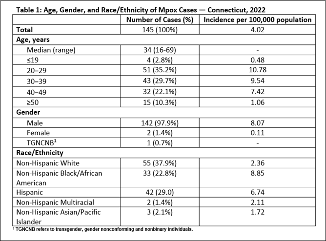 Prior to 2022, mpox cases in people outside of Africa were linked to international travel to countries where the disease is endemic or to contact with imported animals (1). In 2022, more than 29,000 mpox cases were reported in the US, including 145 in CT (3). Mpox can spread to anyone through close, often skin-to-skin contact, including direct contact with mpox rash and scabs (1). During this outbreak, mpox spread primarily through sexual or close intimate contact, with most cases among men and disproportionately affecting people who identify as LGBTQ+ (4).