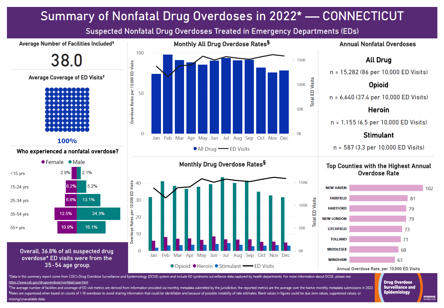 CDC also publishes a national dashboard for SUDORS data, which can be found here. The dashboard can be filtered to show data specifically for Connecticut.