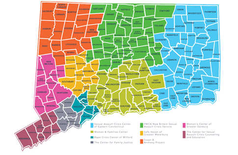 The Sexual Violence Prevention Program, with funding from the Centers for Disease Control and Prevention (CDC), partners with the Connecticut Alliance to End Sexual Violence to provide primary prevention, education, and training to healthcare providers, schools and universities, law enforcement, social services providers, and the community regarding primary prevention of sexual violence. The program aims to prevent sexual violence in Connecticut by increasing individual pro-social knowledge and attitudes, communication skills for respectful intimate and peer relationships, organizational and community capacity for prevention, and societal norms that do not tolerate gender-based sexual violence or other forms of inequalities. This Program builds the capacity of Connecticut's 9 rape crisis centers to provide direct services for rape and other sexual assault victims and their families such as: crisis intervention, individual counseling, free and confidential 24-hour hotlines, including local rape crisis centers and transportation as necessary. These 9 rape crisis centers are depicted below.