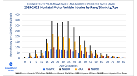Equity in Health is important to transportation safety. Social, environmental, and economic factors are typically not reported with a transportation injury, making inequities difficult to assess. It is understood in Connecticut, middle-aged non-Hispanic Blacks and Hispanics of all races carry the greatest burden of risk for both fatal and non-fatal crash-related injuries.