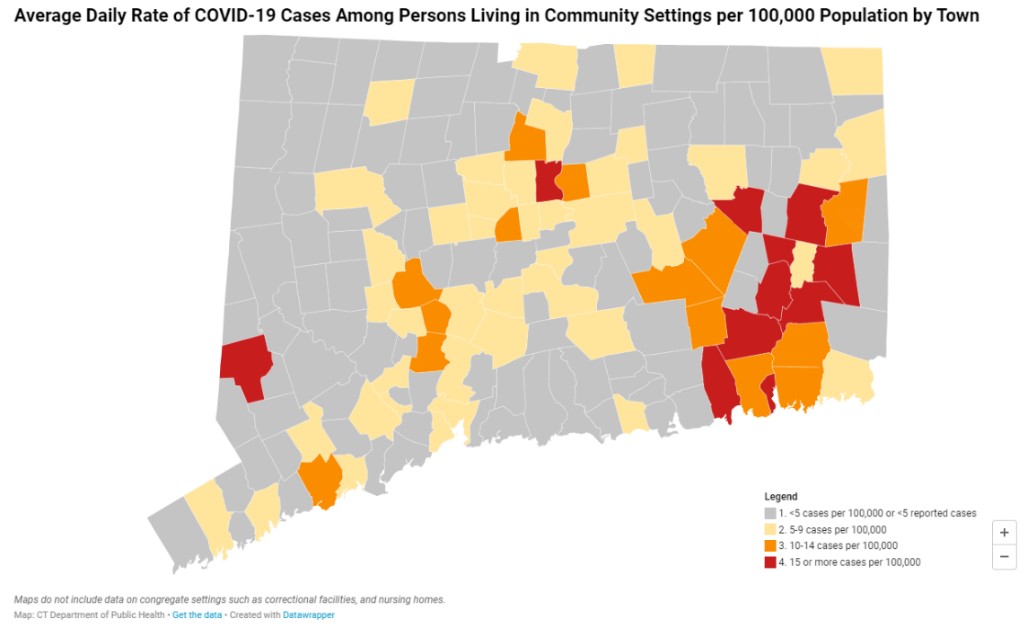 The Connecticut Department of Public Health (DPH) today is launching a new weekly, color-coded COVID-19 alert system for every city and town in the state, showing the average daily case rate per 100,000 population for the last two weeks. The new weekly alert level is also accompanied by municipal-level guidance on recommended actions for individual residents, institutions such as schools, houses of worship and community organizations, plus municipal leaders and local health directors.