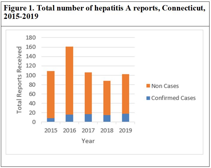 The Connecticut Department of Public Health (CT DPH) uses the current National Surveillance Case Definition to classify hepatitis A cases (2). The clinical criteria used to define hepatitis A cases include an acute illness with a discrete onset of any sign or symptom consistent with acute viral hepatitis (e.g., fever, headache, malaise, anorexia, nausea, vomiting, diarrhea, abdominal pain, or dark urine) AND (a) jaundice or elevated total bilirubin levels ≥ 3.0 mg/dl, OR (b) elevated serum alanine aminotransferase (ALT) levels >200 IU/L, AND (c) the absence of a more likely diagnosis. The laboratory criteria for diagnosis includes a positive immunoglobulin M (IgM) antibody to hepatitis A virus (anti-HAV), OR a positive nucleic acid amplification test (NAAT; such as polymerase chain reaction [PCR] or genotyping) for hepatitis A virus RNA. A confirmed case is classified as a case that meets the clinical criteria and is IgM anti-HAV positive, OR a case that has hepatitis A virus RNA detected by NAAT (such as PCR or genotyping), OR a case that meets the clinical criteria and occurs in a person who had contact (e.g., household or sexual) with a laboratory-confirmed hepatitis A case 15-50 days prior to onset of symptoms, AND not otherwise ruled out by negative IgM anti-HAV or negative hepatitis A virus NAAT testing performed by a public health laboratory. Laboratory reports that do not result in a confirmed case are classified as non-cases.