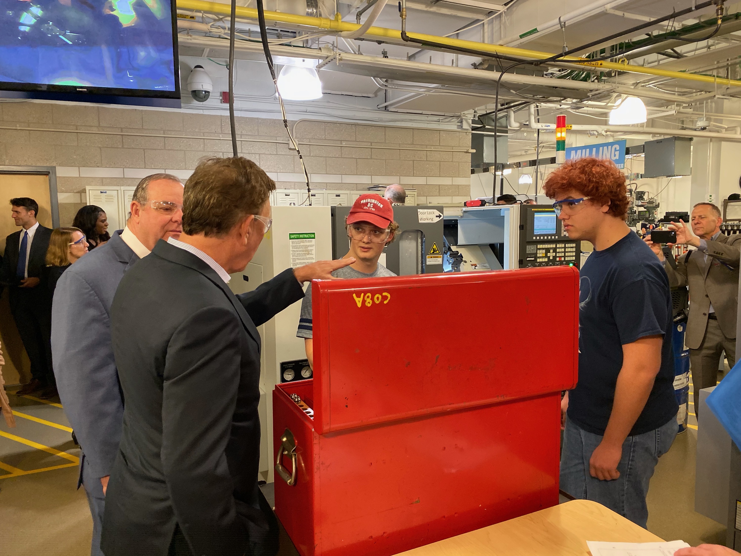 | Governor Ned Lamont speaks with students at the advanced manufacturing technology center of Naugatuck Valley Community College in Waterbury. [Download in high quality] |