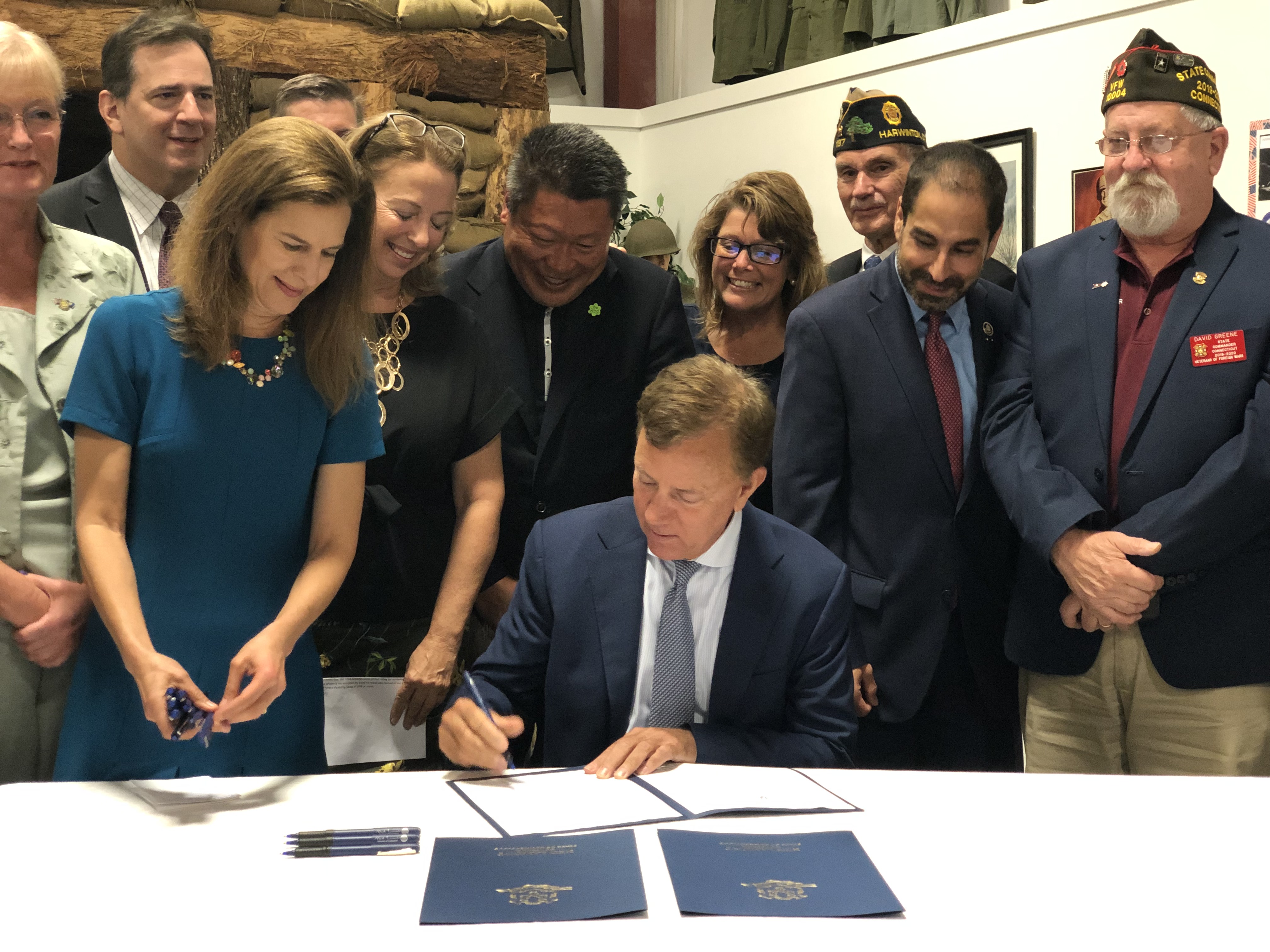 | Governor Ned Lamont signs bills expanding state services for U.S. military veterans at the West Haven Veterans Museum and Learning Center on August 29, 2019. [Download in high quality] |