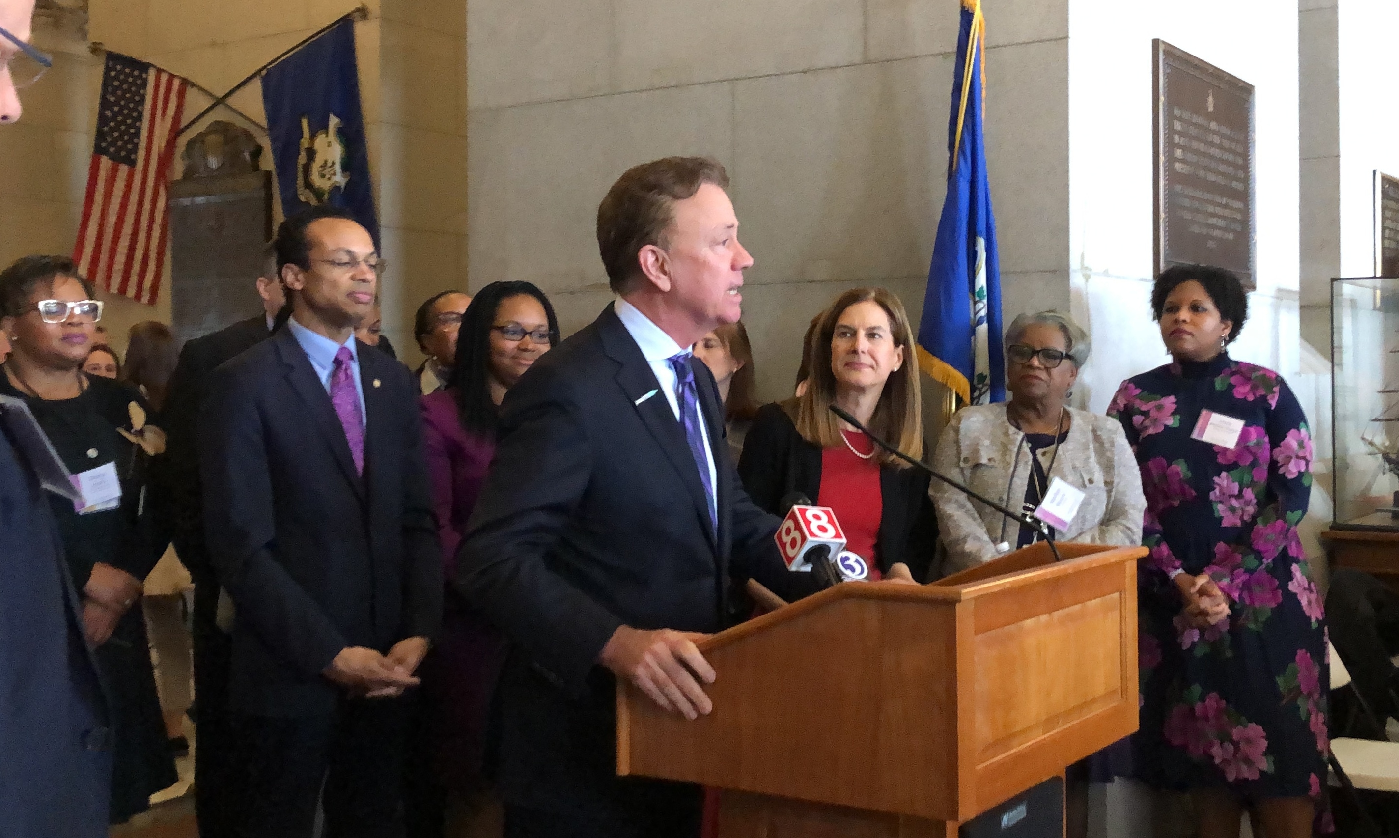 | Governor Ned Lamont and Lt. Governor Susan Bysiewicz speaking during a press conference at the State Capitol during Women and Girls Day activities. [Download image in high quality] |